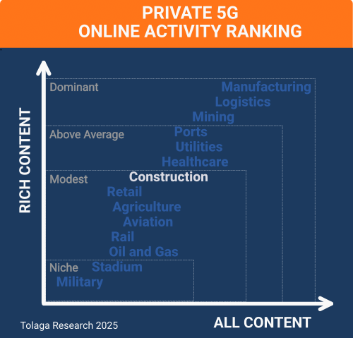 Construction is a modest opportunity for Private 5G (P5G), with our online content survey ranking construction 7th out of the 14 industries researched.