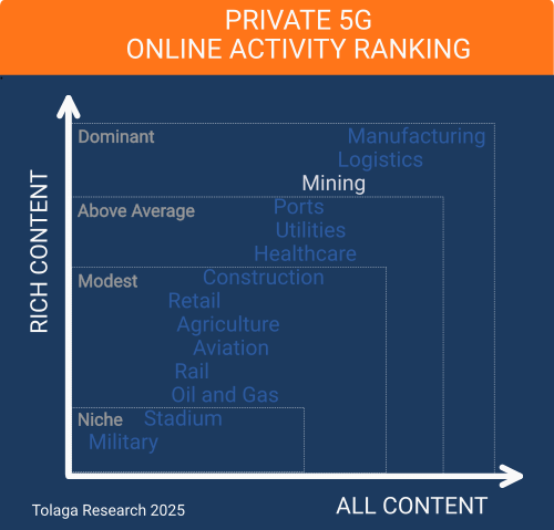 Mining is an important sector for private 5G (P5G), with our online content survey ranking mining 3rd out of the 14 industries researched.
