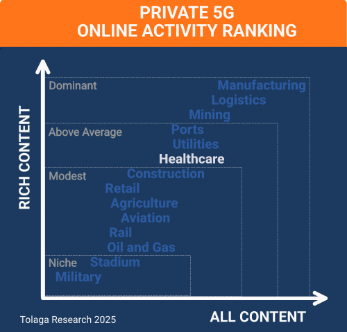 Healthcare is an above-average opportunity for Private 5G (P5G), with our online content survey ranking healthcare 6th out of the 14 industries researched.