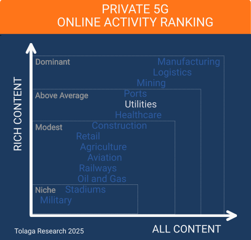 The utilities industry vertical provides above-average opportunities for the Private 5G (P5G) market, with our online content survey ranking utilities 5th out of the 14 industries researched.